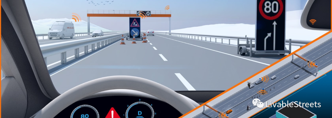 另一(yī)個(gè)應用(yòng)是(shì)傳統的(de)AT<αM系統:直接在頭頂龍門(mén)架标志(zhì)牌上(shàng)顯示信息- '-比如(rú)速度管控。傳統系統可(kě)以實時(s↑¶hí)正确地(dì)顯示信息,但(dàn)主要∑β>&(yào)是(shì)依靠駕駛員(yuán)肉眼識别信息♦βδ。而C-ITS作(zuò)為(wèi)補充©☆>♦,實時(shí)将信息直接發送給汽車(chē)。