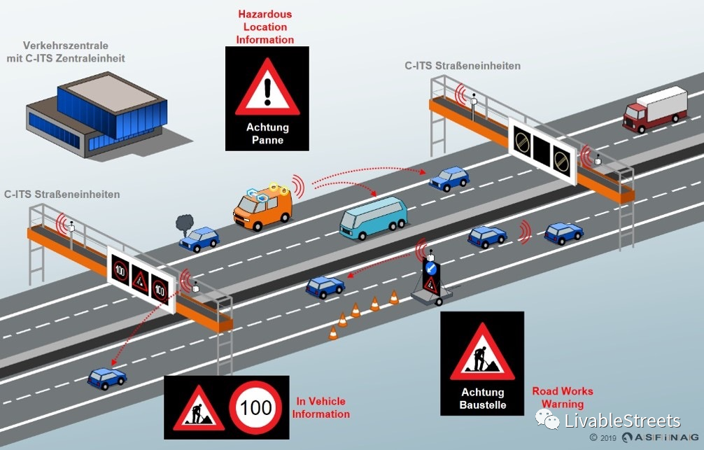 奧地(dì)利ASFiNAG的(de)C-ITS戰略,圖中包括了(le):1. 集成≠→C-ITS中央設備的(de)交通(tōng)控制(zhì)中心,2¶®. 移動車(chē)輛(liàng)發布的(de)危險地(dì)點信息:“注意,前方事(s✔λhì)件(jiàn)!”,3. 施工(gōng)車(chē)輛(liàng® )發布的(de)道(dào)路(lù)施工 €(gōng)預警:“注意,前方施工(gōng)!,4. 車(chē)內(nèi)收到∞'Ω™(dào)的(de)信息“施工(gōng),臨時(shí)限速§★ "100”,以及5. 龍門(mén)架上(shàng)的(d✘₹∏✔e)C-ITS設備單元
