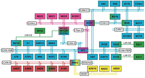 CAN A。車(chē)載智能(néng)信息系統 (CAN×♠γ);CAN C. 發動機(jī)控制(zhì)器(qì)區(qū)域網絡 (CAN);Cλ∞AN C1. 傳動系統控制(zhì)器(qì)區(qū)域網絡 (CAN);CAN D.¶ε$ 診斷控制(zhì)器(qì)區(qū)域網絡(CAN);CAN HMI. 用(yòng)₹Ω戶界面控制(zhì)器(qì)區(qū)域網絡 (CAN);CAN Iγ♦φ§. 傳動系傳感器(qì)控制(zhì)器(qì)區(qū)域網絡 (CAN);CAN L. 混¥ε←§合動力控制(zhì)器(qì)區(qū)域網絡 (CAN);CAN PER. 外∏•(wài)圍設備控制(zhì)器(qì)區(qū)域網絡 (CAN);E≥<αthernet. 以太網;Flex E. 底盤 FlexRay;LIN ε♠↔ E2. 座椅承載識别區(qū)域互聯網 (LIN);LIN G1. 左側大 ×φ(dà)燈局域互聯網 (LIN);G2. 右側大(dà✘¥)燈局域互聯網 (LIN);MOST. 多(duō)媒體(tǐ)傳輸系統。