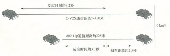 圖中例子(zǐ)是(✔® ¶shì)汽車(chē)以140km/h速度行(xíngσ∞ ♠)駛的(de)時(shí)候,采用(yòng)LTE-V2××±X的(de)汽車(chē)比采用(yòng)DSRC技(jì)術(shù)ε←★π的(de)汽車(chē)擁有(yǒu)額外(wài)的(de)5.9s(9.2s~3.3s"☆)來(lái)決定是(shì)否刹車(chē)。