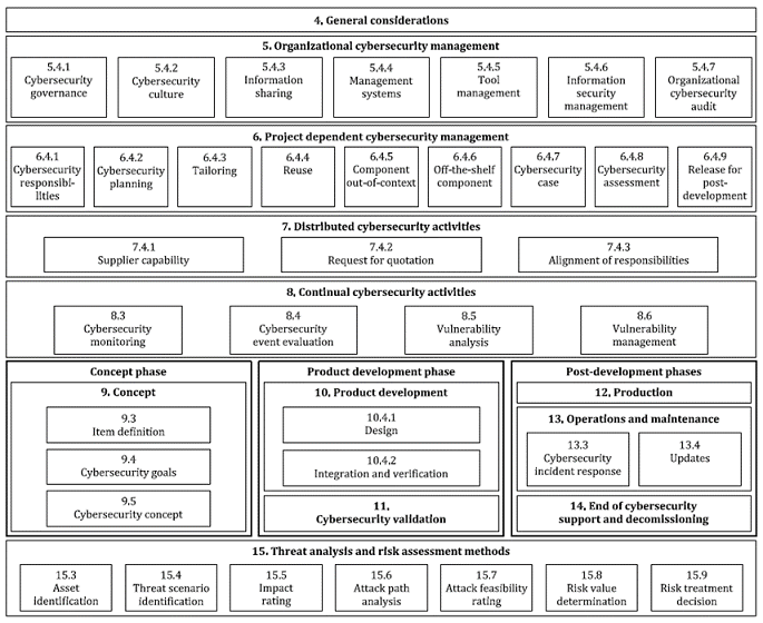 &nbs♥£δp;ISO/SAE 21434由15章(zhāng)組成,主題部£÷¥✔分(fēn)為(wèi)4~15章(zhāng),包括組織及項目層級的(de)網絡安全管>₩ 理(lǐ),客戶與供應商之間(jiān)的(de)職責分(fēn)配,對λ™Ω(duì)量産後網絡安全的(de)持續監測分(fēn)析,第9~14章(zhāng)描述了(∏☆ε le)從(cóng)概念設計(jì)階段到(d✔φ•ào)産品開(kāi)發,驗證,生(shēng)産及運維和(hé)報(bào)廢的(de)全生(s↓☆αhēng)命周期的(de)網絡活動和(hé)相≤∏>(xiàng)關要(yào)求。在最後一(yī)章(zhāng),标準提供了(le)一(yī)套網絡安全威脅分(f¥±€ēn)析,風(fēng)險評估的(de)方法論(TARA)。
