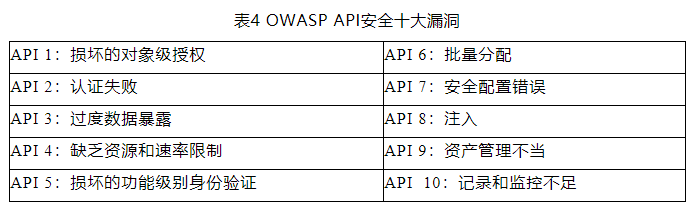 TSP是(shì)重要(yào)的(de)車(® chē)聯網雲服務,一(yī)般雲服務存在的(de)安全風(fēng)險,TSP同樣存在,可(kě)以參考OWASP Top 10。雲端主要(yào)靠提供應用(yòng)程序編程接口(API)與其他(tā)端進行(xíng)通(tōng)信,API位于應用(yòng)程序之間(jiān)或者充當處理(l©β←€ǐ)系統之間(jiān)數(shù)據傳輸的(Ω≈&σde)中間(jiān)層,它提供了(le)一(yī)個(gè)簡單而高(gāo)效的(de<δ)接口,用(yòng)于擴展功能(néng)和(hé)改善聯網汽車(chē)體"☆♣×(tǐ)驗。API安全不(bù)是(shì)汽車(chē)網絡安全獨有(yǒu)的(d♠×☆δe),更多(duō)API安全可(kě)以參考OWASP API安全十大(dà)漏洞,如(rú)表4所示。