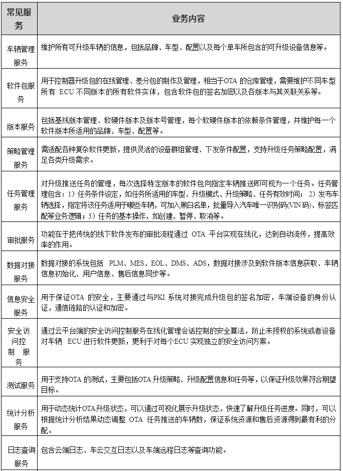 (4)業(yè)務服務層:業(yè)務服務層是(shì) OTA 服務所有(yǒu)業(♠←§"yè)務及相(xiàng)關流程管理(lǐ)功能(néng)在雲平台端的(de)><<φ實現(xiàn), 除了(le)車(chē)輛(liàng)管理(lǐ)服•∑££務、軟件(jiàn)包服務、版本服務、策略管理(lǐ)和(hé)任務管理β<(lǐ) 5 個(gè)支撐 OTA 的(de)核心功能(nΩ£<<éng)外(wài),還(hái)包括關聯系統審批、數(shù)據對(duì)接、信↑•息安全服務、測試、統計(jì)分(fēn)析、日(σ✘rì)志(zhì)查詢等重要(yào)輔助功能(néng)。由于不(bù)同的(d★≠e)企業(yè)內(nèi)部管理(lǐ)存在差異,雲平台所支持的(de)輔助業(yè)務可(kě)能(néng)存∞→在較大(dà)差異,常見(jiàn)服務列舉見(jiàn)表 2-4。
