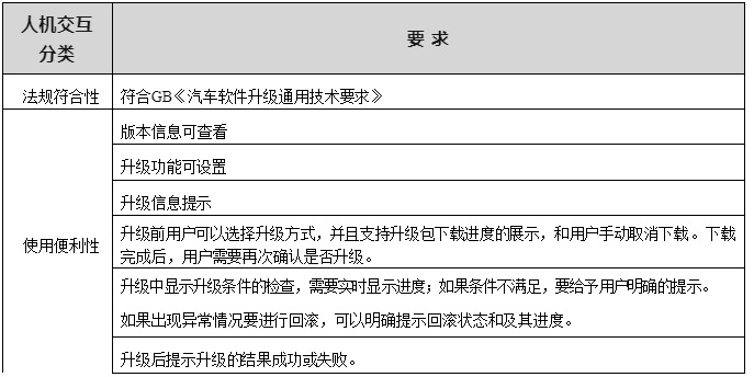 車(chē)端的(de)人(rén)機(jī)交互↑Ω÷主要(yào)體(tǐ)現(xiàn)在信息娛樂(yuè)系統上(shàng)®'¥,覆蓋到(dào) OTA 的(de)整個(gè)過程,包括信息提示、用(yòng)戶确認、關鍵信息顯示等。人(rén)機(jī)交互過程需要(yào)考慮 π的(de)要(yào)素大(dà)緻可(kě)以分(fēn)為(wèi)兩個(gè)方面,即法規符合性和(hé)使用(yòε'ng)便利性,如(rú)表 2-8 所示。