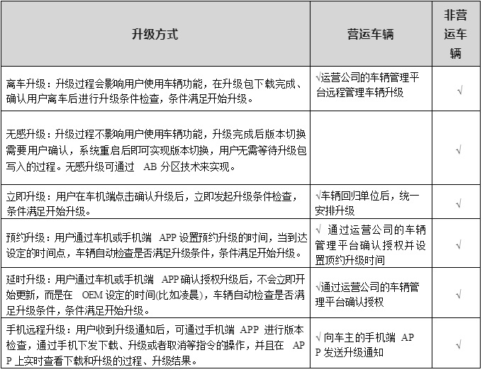 基于實際業(yè)務要(y×∑ào)求,各家(jiā) OEM 的(de) OTA 人(r✘λ↓én)機(jī)交互方式各有(yǒu)差異,本節共總結 6 種主流升級方式,并針→'對(duì)營運車(chē)輛(liàng)與非營運車(chē)輛(liàng)使用(yòn↔♦← g)性質不(bù)同,分(fēn)别展開(kāi)分(fēn)析,具體(tǐ)如(rú)表 2-10 所示。